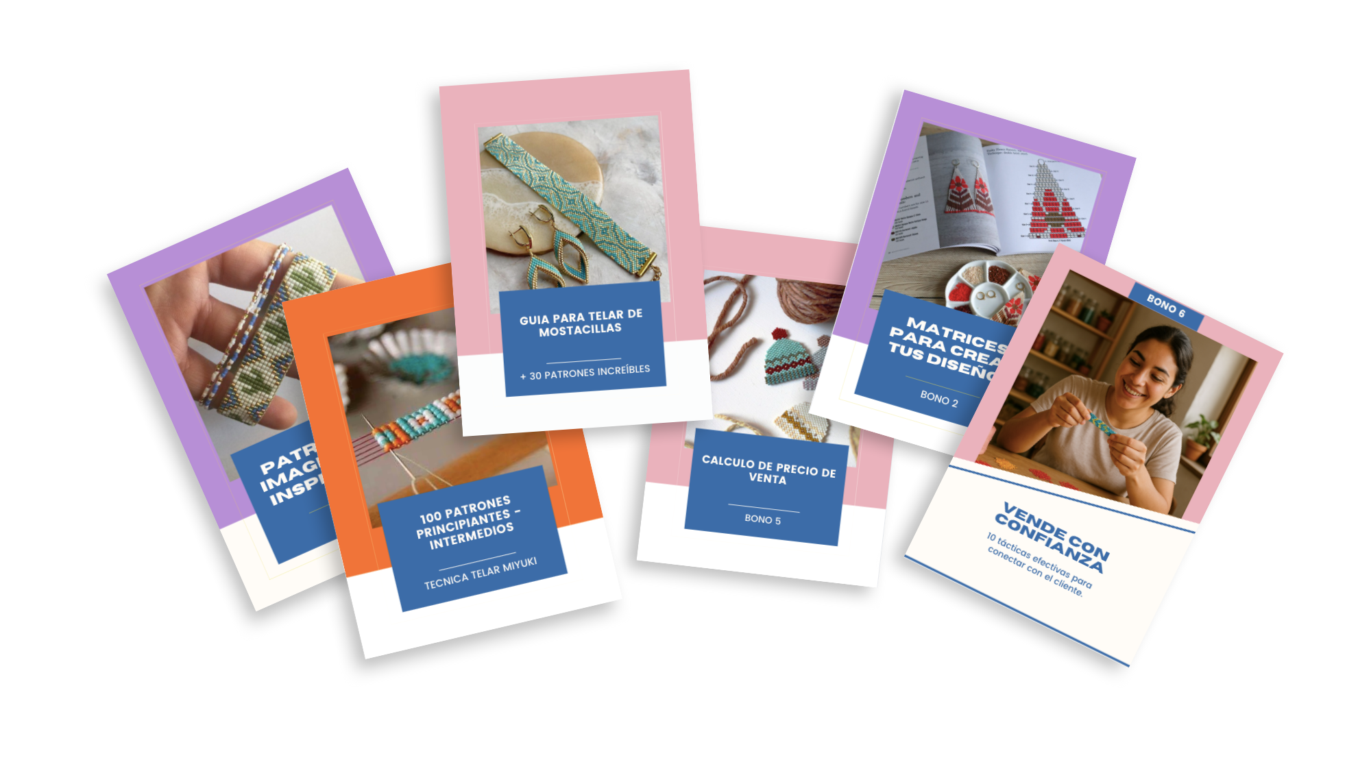 Vas a recibir un ebook digital en formato PDF directamente en tu correo electrónico. Incluye el paso a paso para aprender a crear pulseras, aros y anillos con Miyuki y mostacillas, junto con consejos, técnicas y plantillas para que empieces a vender tus creaciones desde casa. Lo puedes descargar y conservar para siempre. RECUERDA CHEQUEAR LOS CORREOS SPAM SI NO LO RECIBES AL INSTANTE.
